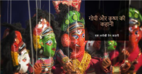 अगले दिन प्रातः गोपी बहुत से मिष्ठान ले मन्दिर में पहुंच जाती है। देवी की प्रतिमा के समक्ष सब रख धूप दीप कर बैठ जाती है। कान्हा अपने सखाओं संग वहां पहुंच जाते हैं। गोपी कान्हा को देख बहुत प्रसन्न होती है। कान्हा बरसाना की ओर इशारा करके बोलते हैं उन देवी का स्थान जगत में सबसे ऊपर है। उनके दर्शन तो बड़े बड़े ऋषि मुनियों को दुर्लभ हैं। वो देवी तेरी मनोकामना पूर्ण करेंगी परन्तु तुम्हें पहले मुझे प्रसन्न करना होगा तभी मैं तुमको देवी के दर्शन करवाऊंगा। कान्हा तुमको कैसे प्रसन्न करूँ। ये जो सब स्वादिष्ट मिष्ठान तू लाई है ये सब मुझे और मेरे सखाओं को खिला दे। नहीं कान्हा ये तो सब देवी पूजन हेतु है। चल छोड़ फिर तुझे देवी दर्शन नहीं हो सकता। अपनी कामना भूल जा तू। गोपी ये भी चाहती है कि उसके प्रियतम कान्हा ये सब मिष्ठान पा लें परन्तु मन में अभी देवी दर्शन की लालसा भी है। गोपी की स्थिति विचित्र हो रही है। कान्हा कहते हैं गोपी देख मेरे पास शक्ति है मैं किसी भी देवी देवता को अपनी इच्छा अनुसार बुला सकता हूँ। कान्हा तुम मुझे मूर्ख बना रहे हो,अपने माखन से सने हुए मुख को साफ़ करने की शक्ति तो तुम में नहीं है। मैं ही मूर्ख रही जो तुम्हारी बातों में आ गयी । अब तुम भाग जाओ यहां से और मुझे देवी दर्शन करने दो।कान्हा ललचाई दृष्टि से मिष्ठान की और देखते हैं। गोपी खीझ कर उनको मारने को दौड़ती है।